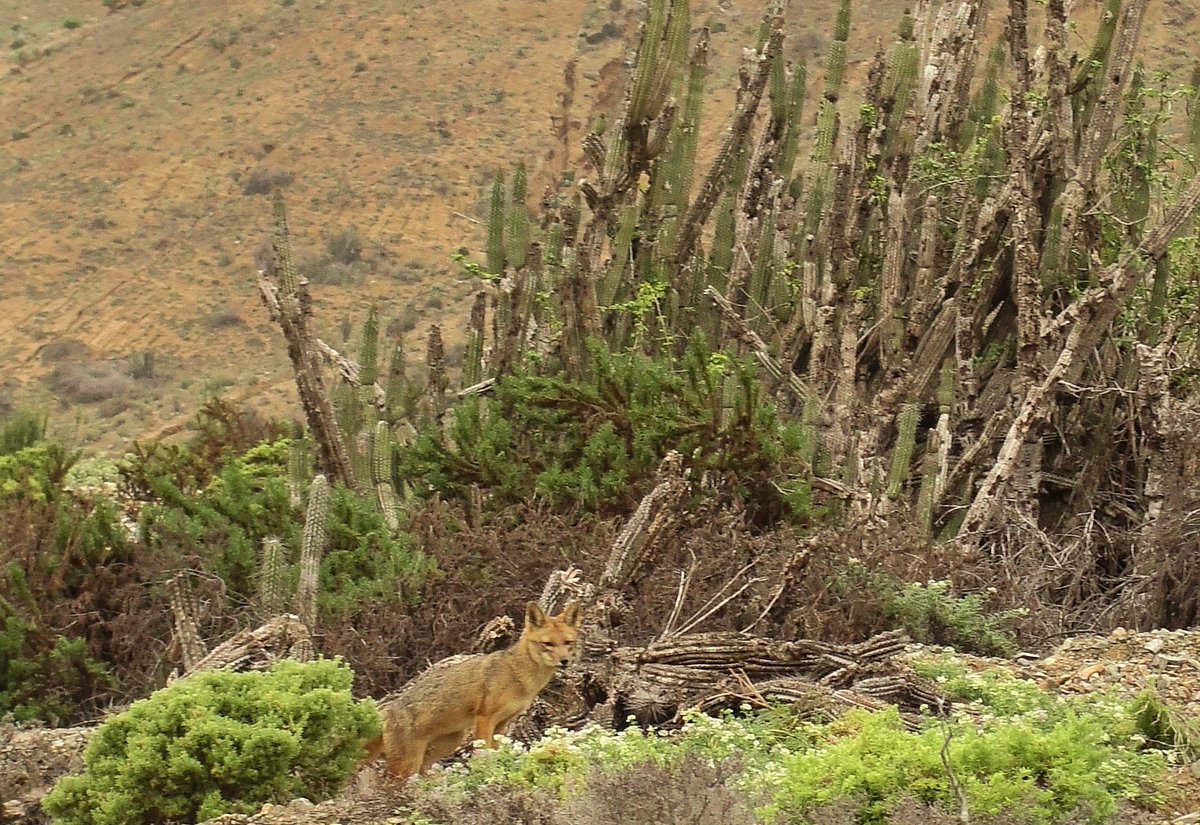 Zorro culpeo (Lycalopex culpaeus), cánido más grande en Chile. Habita una gran variedad de climas, aunque prefiere los límites de arroyos y comunidades arbustivas y densas. Amenazas: destrucción de su hábitat y la caza. En la costa del desierto.