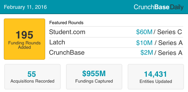 Today's #CBDaily: $955M in 195 rounds added & more! http://bit.ly/1br9NXq pic.twitter.com/9fR6PB0sHN