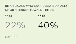 Democrats less likely to see Russia as an ally Republicans more likely to see Russia as an ally Republicans: 2014: 22% 2018: 40% 18%+ increase in 4 years 4.5%+ increase each year since 2014 to 2018 *Of Note, Obama administration placed sanctions on Russia in 2014 Interestinghttps://twitter.com/GallupNews/status/1017753027497938944 …