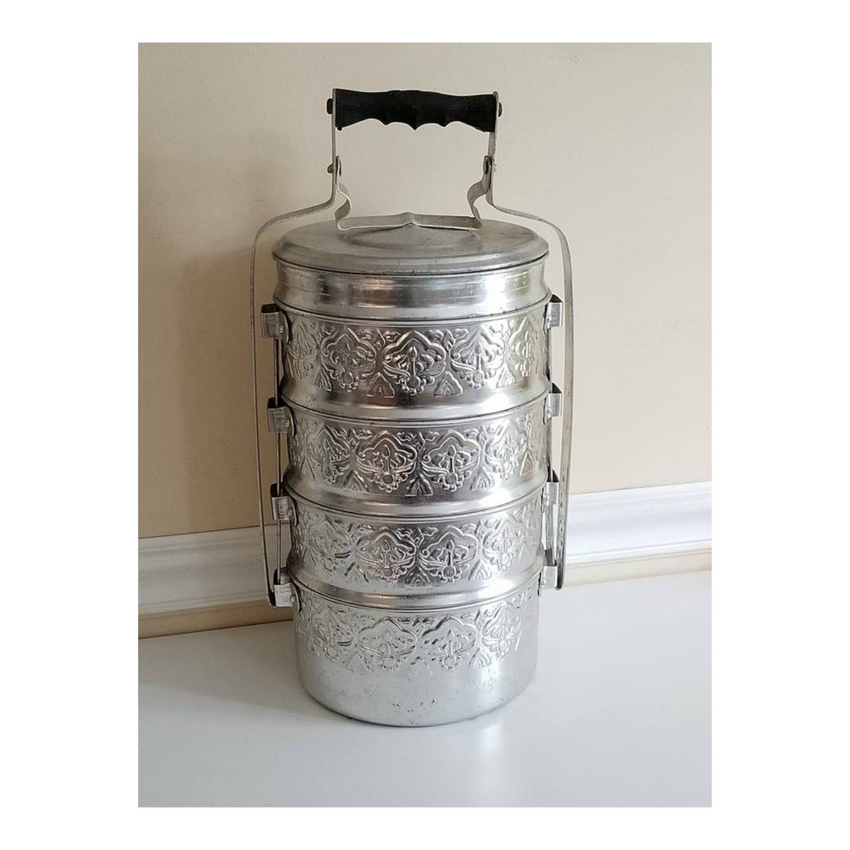 Vintage Tiffin Food Carrier, 5 Compartment Food Caddy, Embossed Aluminum, Bento Box, Metal Food Box, Storage Box, Glamping, 1950s https://etsy.me/2uAAAzc