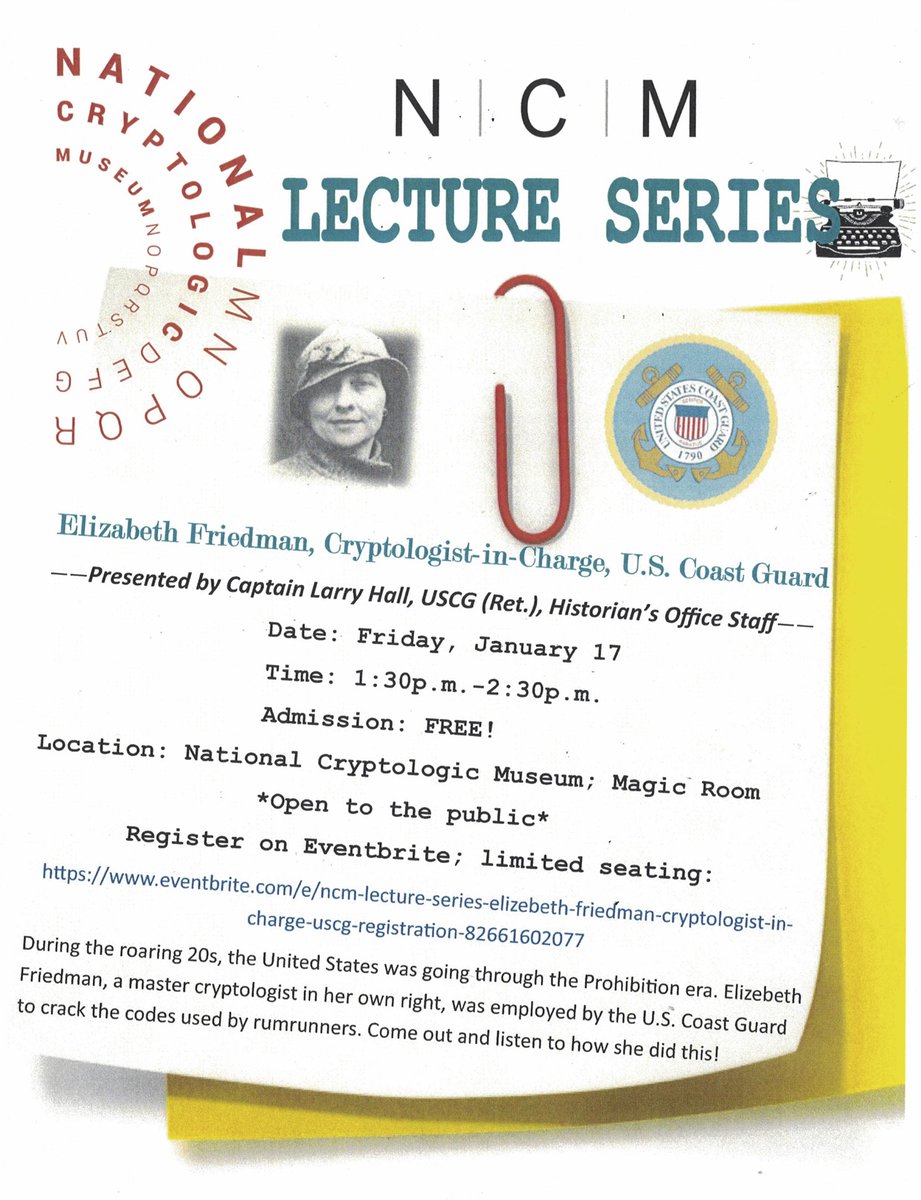 Great News! There are still seats for the NCM Lecture Series on 17 Jan: "Elizebeth Friedman, Cryptologist-in-Charge, USCG." Retired USCG Capt Larry Hall will talk about how she cracked codes used by rumrunners & smugglers and brought them to justice: http://bit.ly/2rGFLiL pic.twitter.com/WzyCw7jvXb