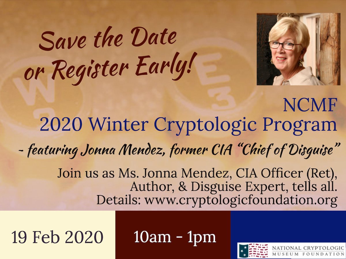 Registration ends 13 Feb for our Winter Cryptologic Program: Don't miss a fascinating presentation by Disguise Expert & Former CIA Officer Ms. Jonna Mendez on 19 February. Registration is $25 & includes lunch. Register now: http://bit.ly/37btK3Q pic.twitter.com/6E8r9mWgNR