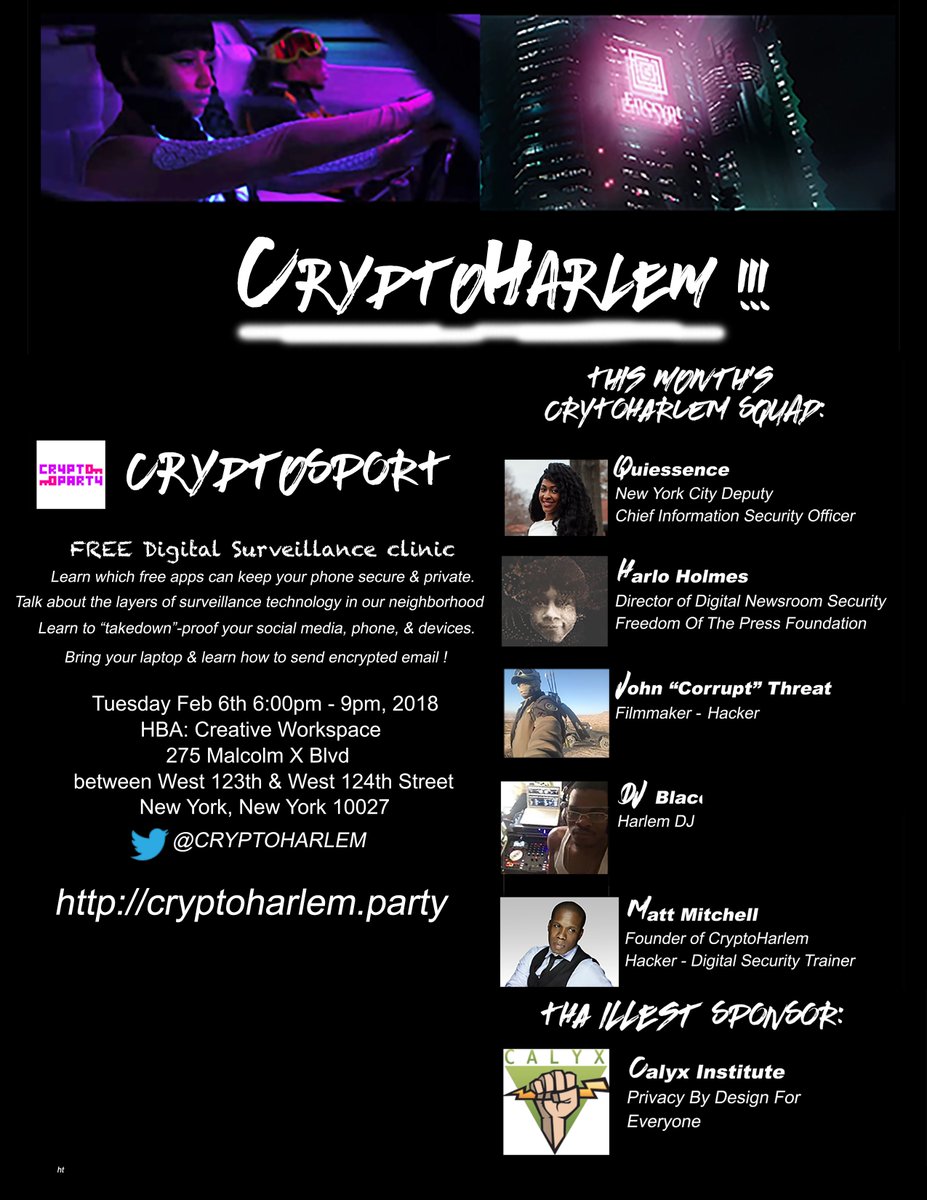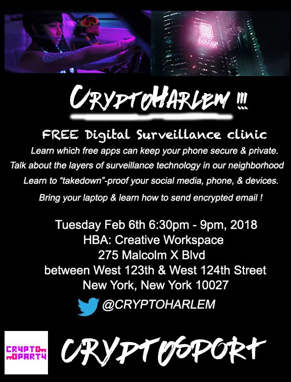 The next cryptoHarlem is Tuesday March 12 at 6:30pm at 275 Malcolm X Blvd, New York,NY 10027. We will discuss government jobs in cyber. https://www.meetup.com/New-York-Cryptoparty-Network/events/259673180/ …