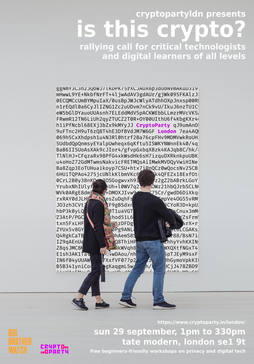 IS THIS CRYPTO...? CryptoPartyLDN is coming to the Tate Modern, Sun 29 Sept, 1-3.30pm. You're invited! Come for digital privacy tips, tricks + talks. Want to help give training? Or a lightning talk? DM us! More info: https://www.cryptoparty.in/london pic.twitter.com/KpMQo1ZCmv