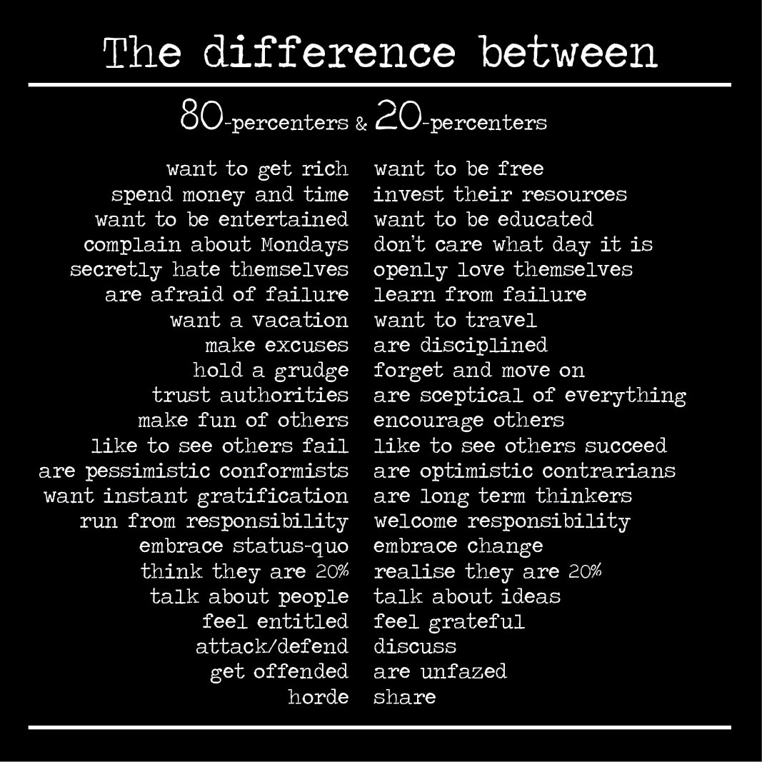 For my 1000th tweet, I re-did the one about differences between 20- and 80-percenters. It seems obvious the society is run using the lowest common denominator between people for this very reason.