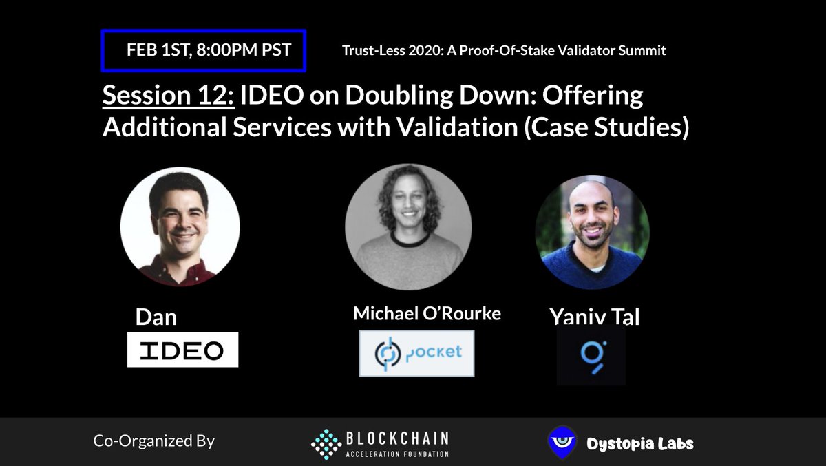 #Trustless2020@IDEOVC-moderated panels tonight @ 8pm PST: "Doubling Down: Offering Additional Services with Validation" w@delitzer “Validator Tooling and UX” w@GavinMcDermott Tune in here: https://trust-less-2020.dystopialabs.com pic.twitter.com/BzCBRwYWwe