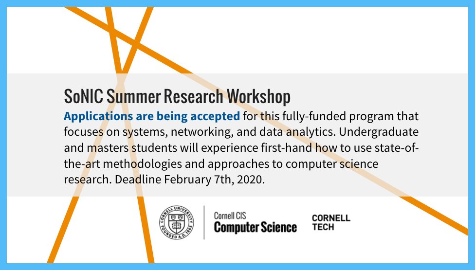 SoNIC Summer Research Workshop: applications are being accepted for this fully-funded program that focuses on systems, networking, and data analytics. Deadline February 7th, 2020. https://www.cs.cornell.edu/content/workshop/sonic …pic.twitter.com/P7kohomkxu