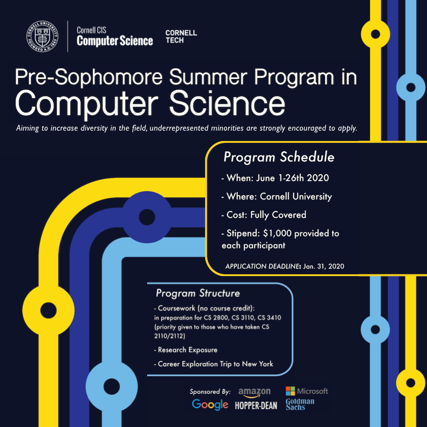 Cornell CS has organized a Pre-Sophomore Summer Program to convene this June. Application deadline: January 31, 2020. Aiming to increase diversity in the field, underrepresented minorities are strongly encouraged to apply. https://www.cs.cornell.edu/events/presophomoresummerprogram …pic.twitter.com/zY6yCQcBLj
