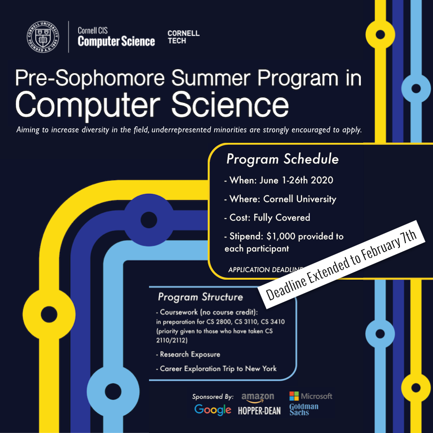 New Deadline for Pre-Sophomore Summer Program in Computer Science: February 7th. Aiming to increase diversity in the field, underrepresented minorities are strongly encouraged to apply. https://www.cs.cornell.edu/events/presophomoresummerprogram …pic.twitter.com/bBXbx7rYOG
