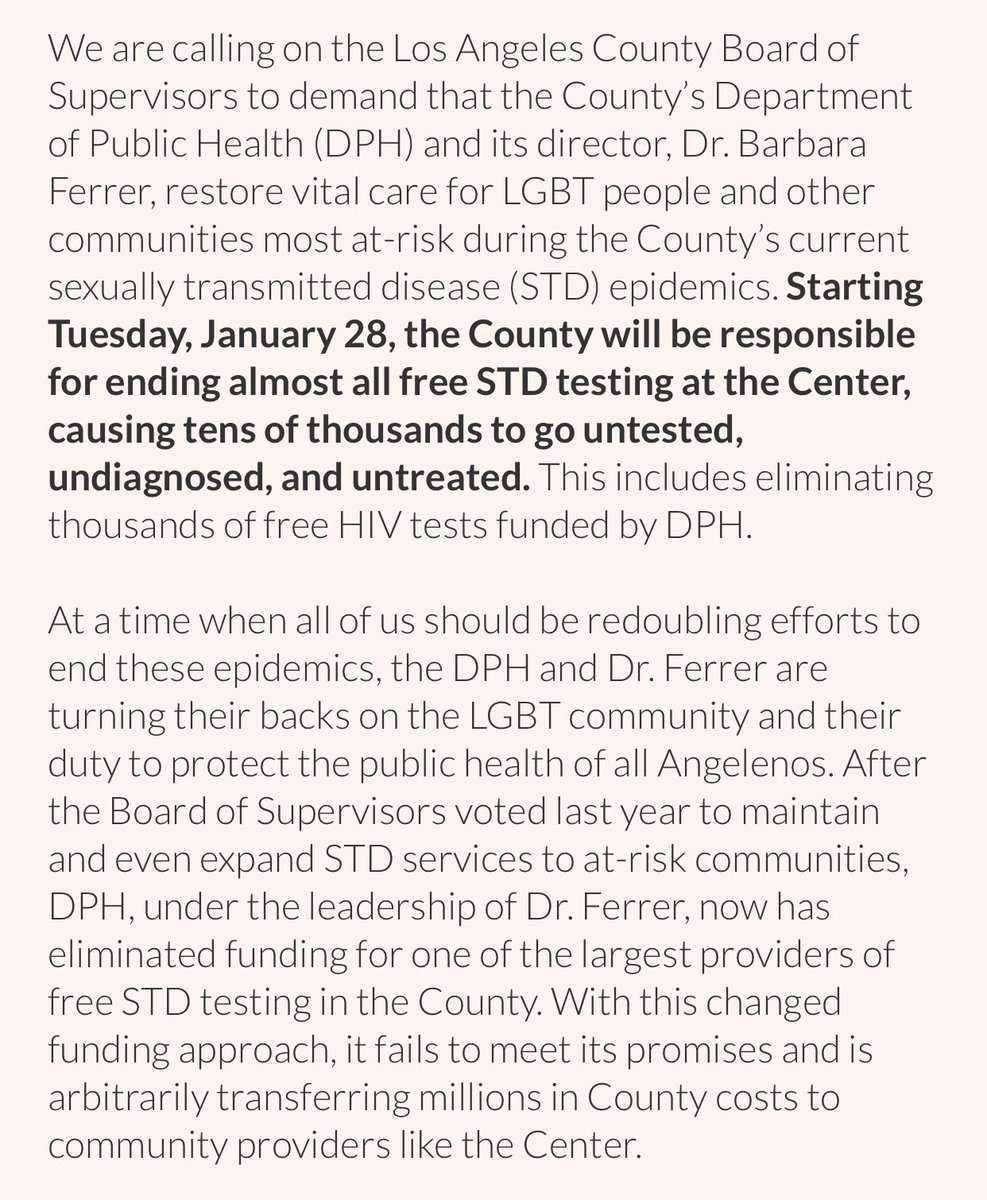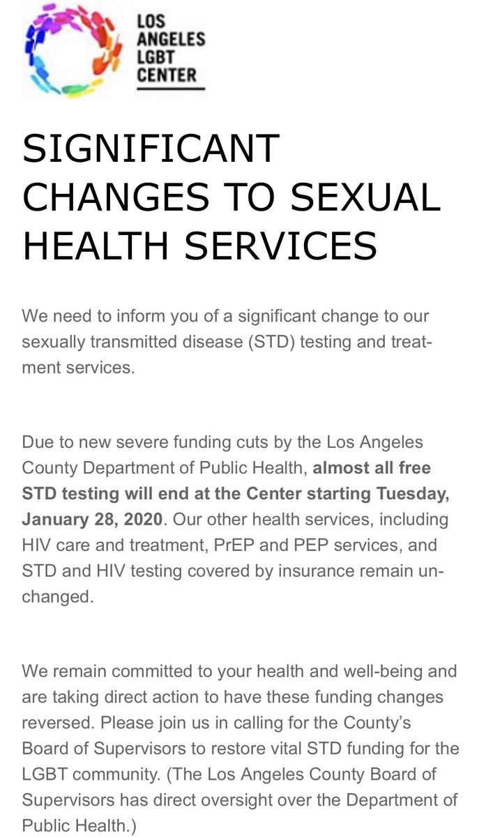 This is FUCKED. Tomorrow the Los Angeles County Board of Supervisors will be ending almost all free STD testing at the Los Angeles LBTG Center, causing tens of thousands to go untested, undiagnosed, and untreated.https://lalgbtcenter.org/about-the-center/press-releases/los-angeles-department-of-public-health-ends-accessible-std-testing-for-lgbt-people-in-los-angeles-202001271558 …