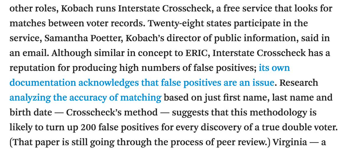 TIL Kris Kobach has service that tries to detect people registered in multiple states using only first name, last name, and DOB.