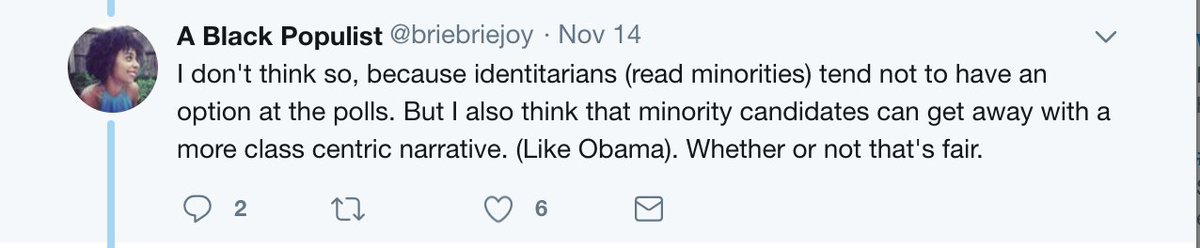 cause class-based policies have definitely motivated black folks more than a) identity or b) black-focused issues like criminal justice reform. It was definitely Hillary's lack of an economic message not her being a white lady with a history of racism that cost her blk votes. OK.