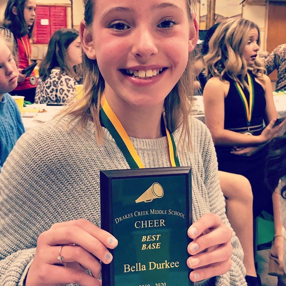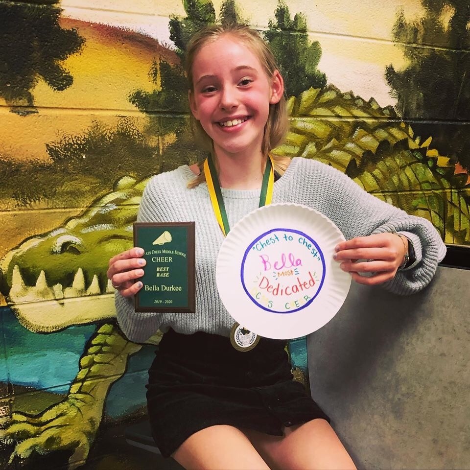 Congrats to our very own Bella D. for her cheerleading awards she received this weekend. At her DCMS banquet, she was awarded Best Base, Most Dedicated, and an Academic Award for straight As! Congrats Bella!!
