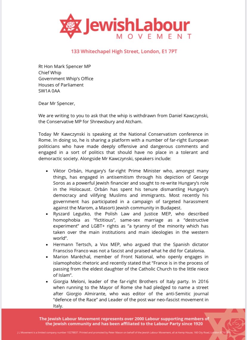 Jewish Labour Movement calling for sanctions against Conservative MP for sharing platform with Viktor Orban, Marion Marechal & other far right politicians at conference in
