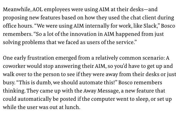The birth of the away message—and perhaps all the asynchronous status updates we hold so dear today—tucked inside this barnburner origin story on AOL Instant Messenger by