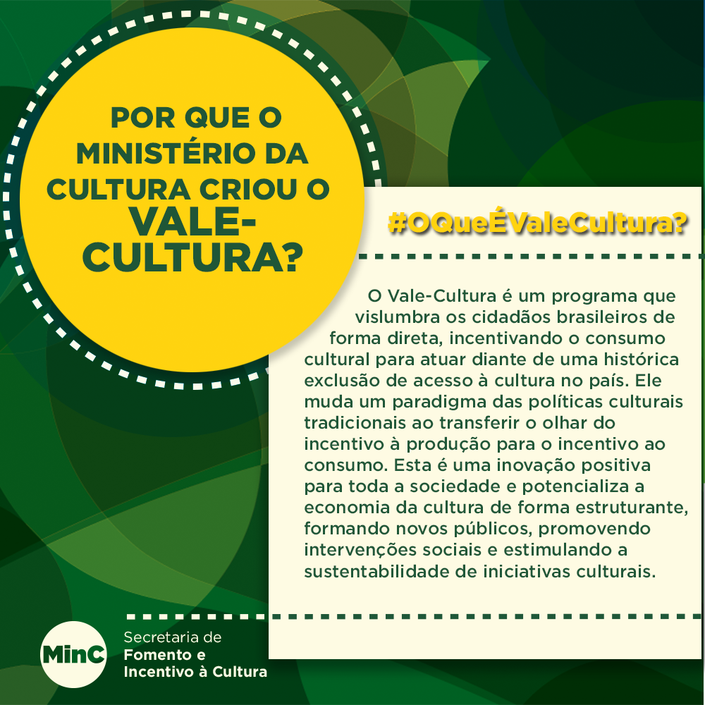 #ValeCultura? Incentivar o consumo cultural e mais.#OQueÉValeCultura http://www.cultura.gov.br/valecultura pic.twitter.com/Ci8dvKyE7T