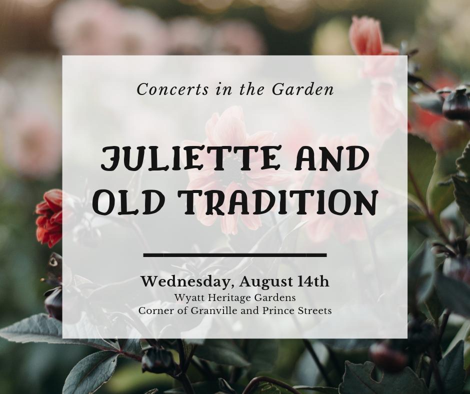Tonight our "Concerts in the Garden" series continues with Juliette and Old Tradition! 6:30- 8:30 pm in the gardens of the Wyatt Heritage Properties. Admission is by donation. It's going to be a beautiful day so come join us in the gardens for a relaxing evening of music!pic.twitter.com/0ne8DpNXSb