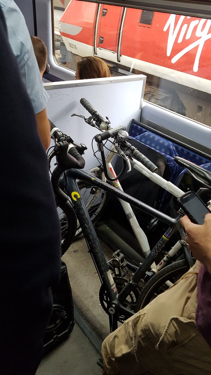 Train's packed to the gills. There's a douche with a bike using three seats for his precious pedal toy.pic.twitter.com/Zsu4tk7RWK