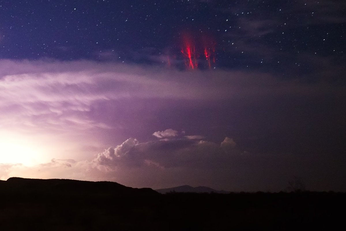 (Sprites are brief high-altitude discharges of electrical activity above powerful lightning storms. Their red color comes from excited oxygen atoms.)https://twitter.com/sirlinjohn/status/1019672665089429504 …