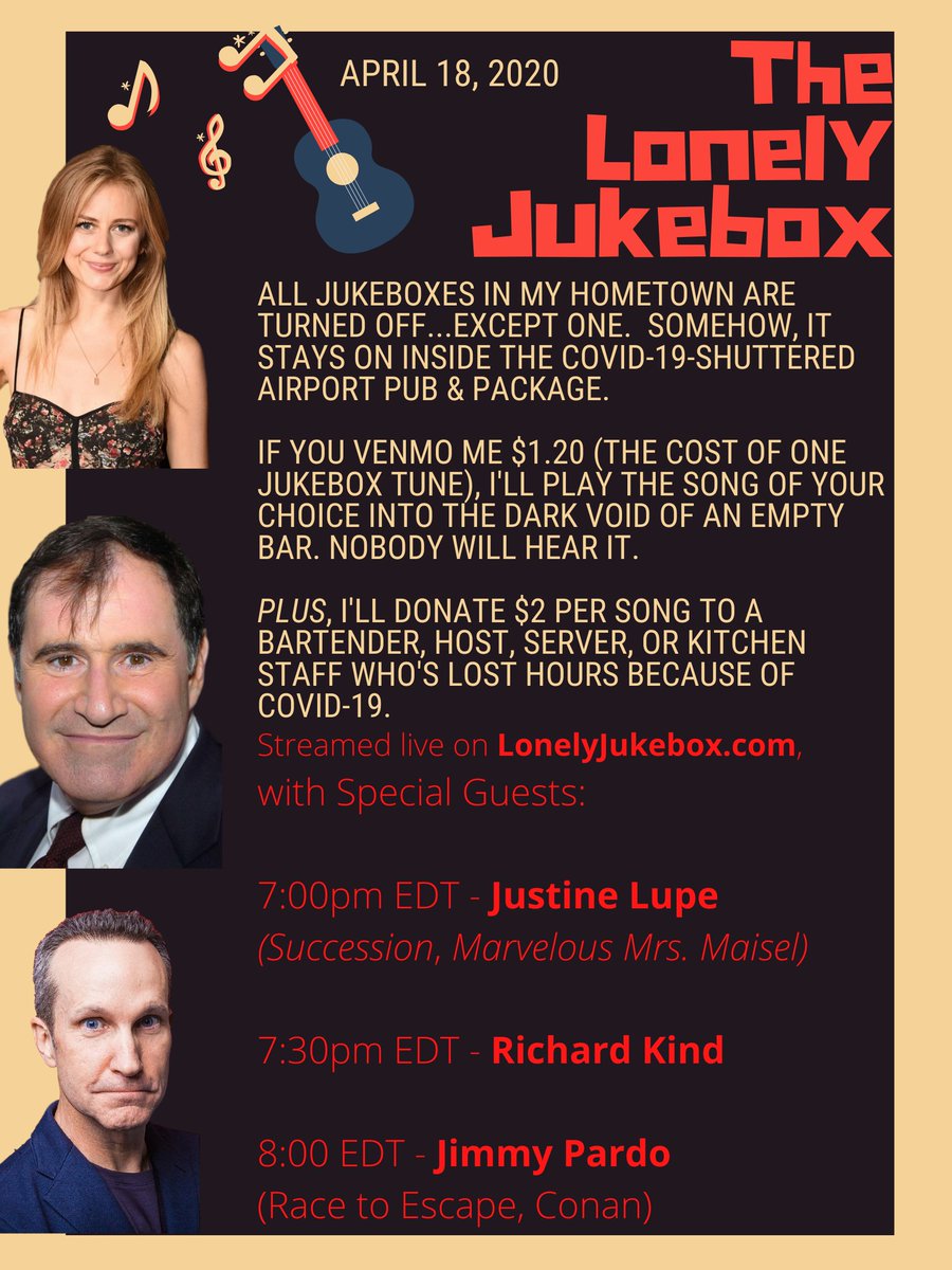 @jimmypardo,@RealRichardKind, and Justine Lupe walk into a bar. An empty bar. With locked doors. Saturday at 4pm PDT. Tune in. Pick a song. Nobody will hear it. And money will go to support hard-working restaurant workers. http://lonelyjukebox.com pic.twitter.com/JexpQNuAJB