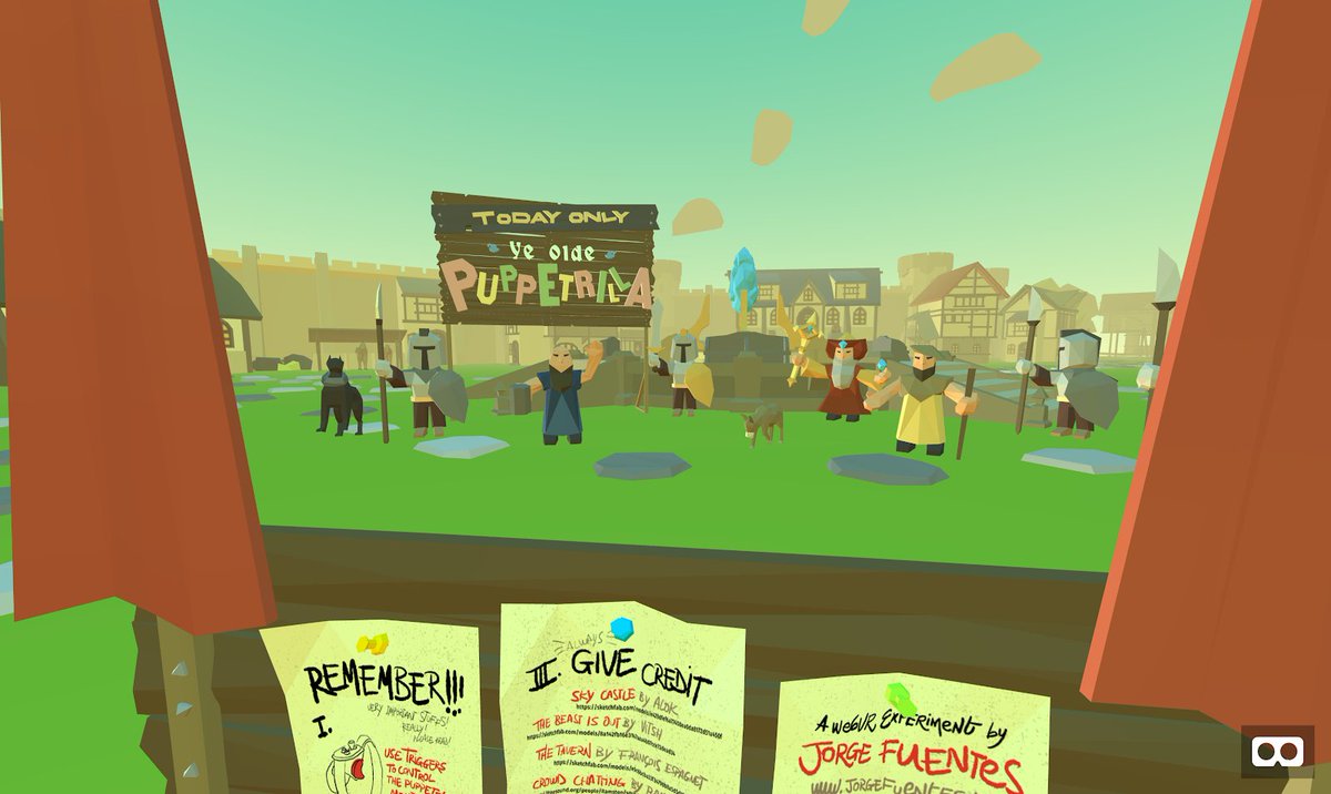 #webVR experiment "Ye Olde Puppetrilla" here - https://www.jorgefuentes.net/projects/puppetrilla/ … It won first prize at the@mozillareality webVR challenge and was made with@aframevr. You'll need an#HTCVive,#Oculus Rift or#microsoft#mixedreality headsetpic.twitter.com/j257wxzoTo