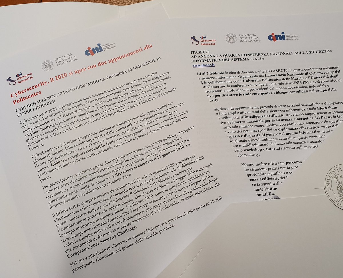 #CyberSecurity il 2020 si apre con due appuntamenti alla Politecnica.@CyberChallengIT selezione e addestramento di studenti nuovi cyber defender e@itasec20 quarta conferenza nazionale sulla CyberSecurity con ospiti autorevoli nazionali e internazionali.pic.twitter.com/WOHBTKSAXI
