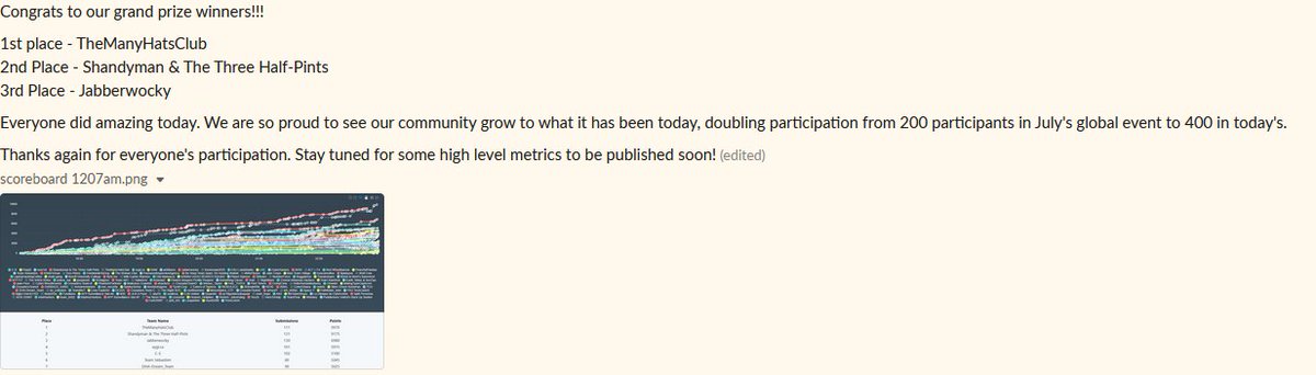#MissingCTF winners! 1st place - TheManyHatsClub 2nd Place - Shandyman & The Three Half-Pints 3rd Place - Jabberwocky We are proud to see our global#OSINTForGood community's growth from our last global event, growing from 200 to 400 contestants!pic.twitter.com/CkQ5Y0dGHD