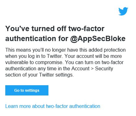 @AppSecBloke deactivated his account last night,@Twitter arbitrarily disabled 2FA on it. Here's the notification. Mike didn't disable 2FA, Twitter did. Beware. Deactivation of your account may lead to losing it through takeover.#HereForYoupic.twitter.com/nbbhK7pMQx