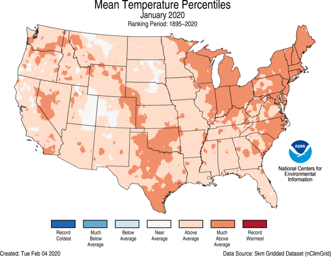 #January 2020 ranked 5th warmest on record for the contiguous USA, per@NOAANCEIclimate https://go.usa.gov/xdKWe#StateOfClimatepic.twitter.com/g25Bobncxs