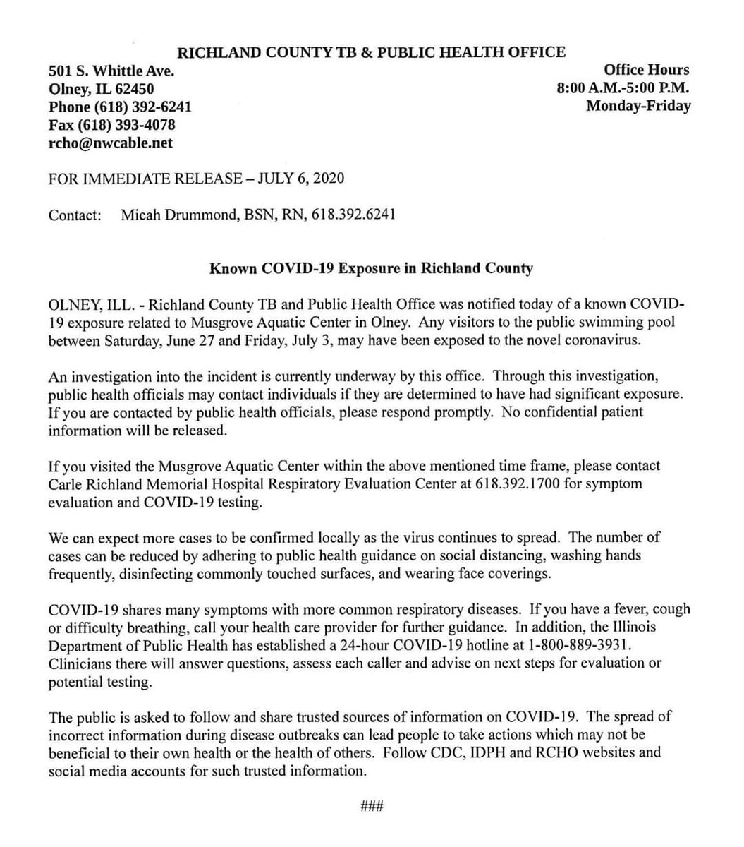 UPDATE Known COVID-19 exposure in Richland Co (Olney City Pool)