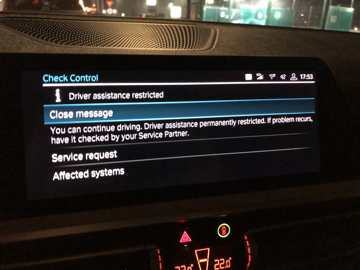 @BMW G20 for 10 km and got a Driver Assistance restricted. I would have expected better from a car so expensive. It seems this is a issue happening with all the 2019 X3, X5 and 3 series. Disappointed.pic.twitter.com/cQ4wUtiqfp