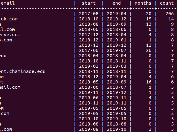 Here I've tweaked the query to show the number of months between the first and last purchase. This helps provide a sense of whether these people are using it recurring or just making a bunch of templates at once.pic.twitter.com/rB8V1iwOIJ