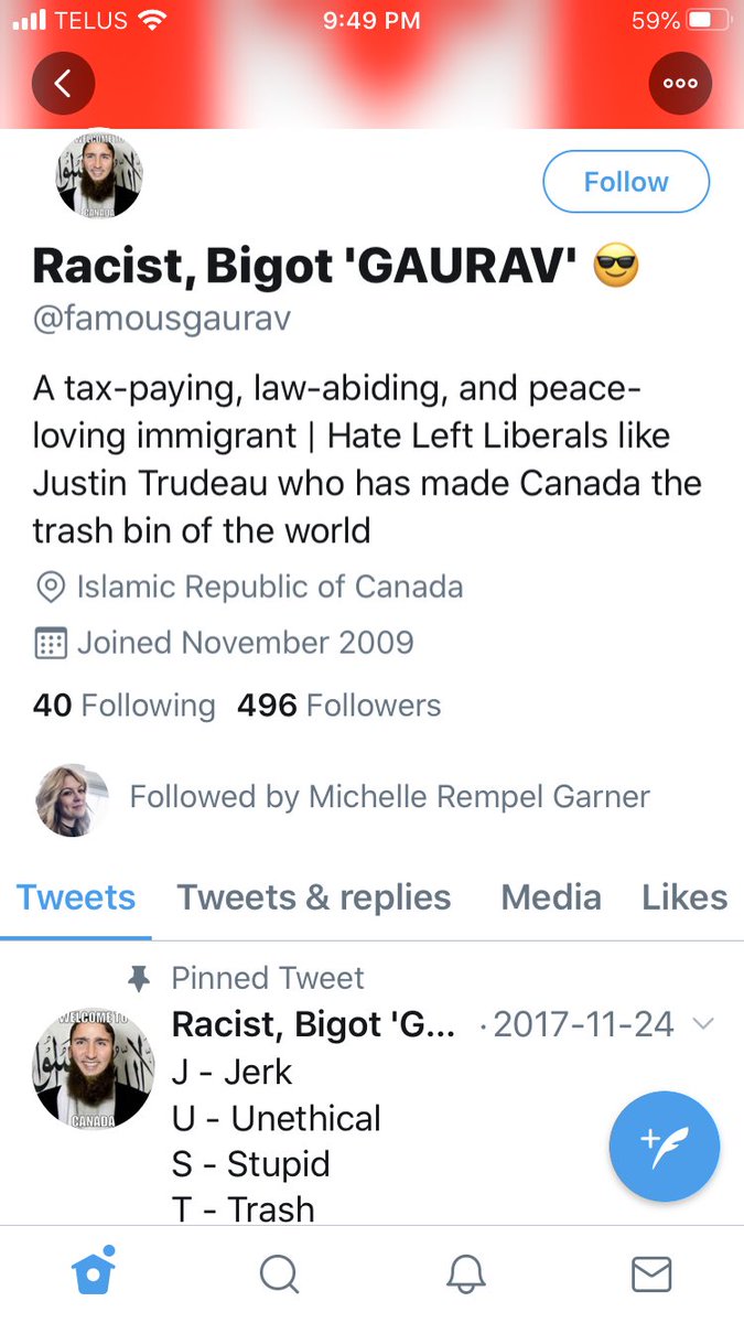 @CPC_HQ Any idea why your#MichelleRempel would be following this racist pig? I would hope one of your MPs would be of better character than this. This truly states who she really is.Hvala. Twitter će to iskoristiti za poboljšanje vaše vremenske crte. PoništiPoništi -