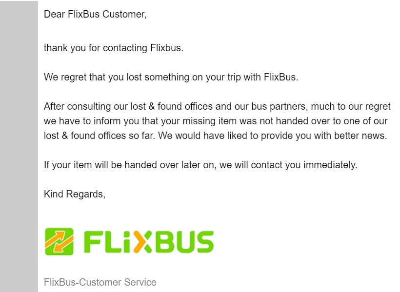 For anyone wondering how @FlixBus_FR handled my case: they didn't. Almost one month after my luggage got stolen on their bus, I still keep getting automated emails. I ask questions and get zero response. Instead they keep sending me the same email over and over again. 🤬🤬pic.twitter.com/6Am74W4pE2