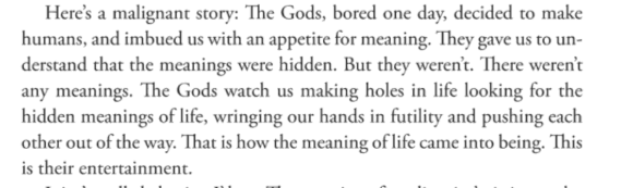 "The Gods, bored one day, decided to make humans, and imbued us with an appetite for meaning. They gave us to understand that the meanings were hidden. But they weren't. There weren't any meanings. The Gods watch us making holes in life looking for the hidden meanings of life..."pic.twitter.com/JJ0YyhRpAI