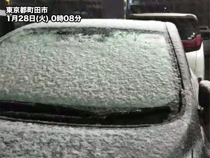 深夜から雪に変わった東京23区は西部でうっすらと雪が積もっています。都心周辺で積もることはない見込みですが、朝は関東南部で局地的に雪の強まるおそれがあり、急な積雪に注意が必要です。 https://weathernews.jp/s/topics/202001/280035/ …pic.twitter.com/4AZ7359qoI