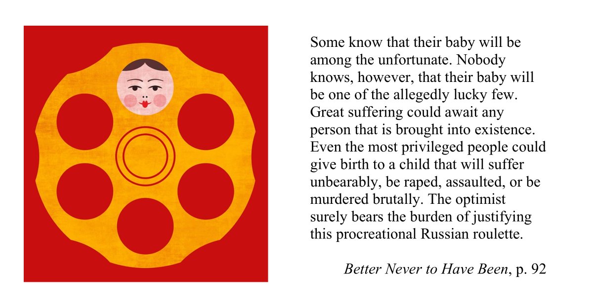 Having children amounts to playing Russian roulette, which can hardly be justified. https://www.amazon.com/Better-Never-Have-Been-Existence-ebook-dp-B000TODSCY/dp/B000TODSCY/ …pic.twitter.com/MWaznQqEjr