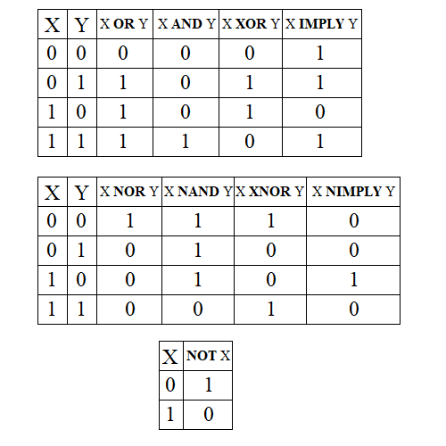 OR, AND, XOR, IMPLY, NOR, NAND, XNOR, NIMPLY, NOT ∨, ∧, ⊻, →, ↓, ↑,