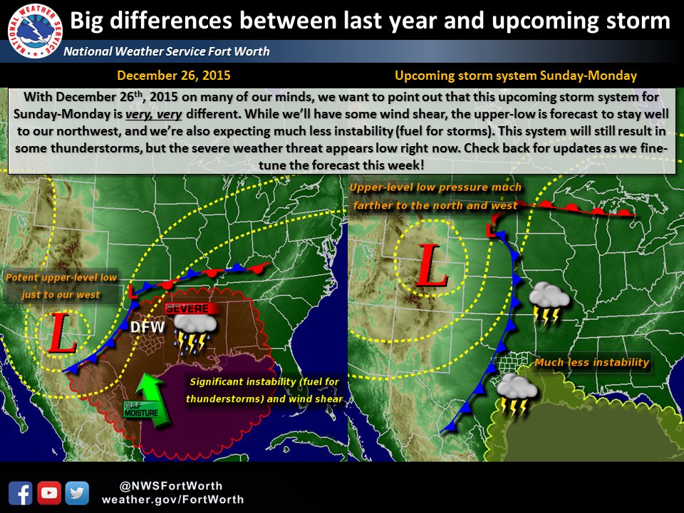 Showers & storms in the fcst Sun-Mon, but big diffs. between this system and December 26 of last year.