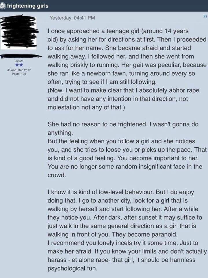 "I know it is low level behavior, but I do enjoy doing that. After dark just walk in the same direction as a girl in front of you. They become paranoid. I recommend you lonely incels try it some time, just to make them afraid. If you know your limits, it should be fun."pic.twitter.com/kT0qvEsrVu
