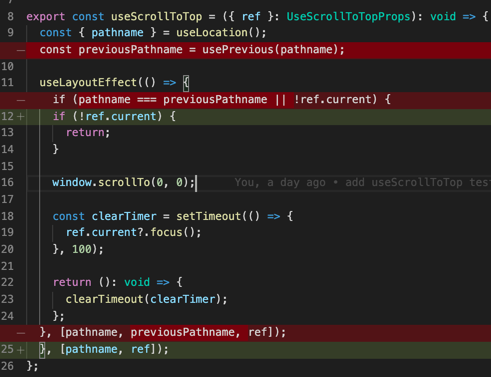 #reactjs hooks, I have had anything but frustrations. This git diff shows, that I just did not get them at first. I was needlessly using usePrevious like I would have in componentDidUpdate but there really is no needpic.twitter.com/zywoGUEi7x