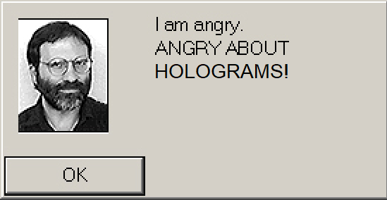 "ah but maybe they are using a cheaper, lower fidelity hologram emitter to save on res-" no. in "author, author" they have like a bajillion holographic EMHs repurposed to mine rocks so don't come at me with that "ah shucks they just don't have enough good emitters" nonsense