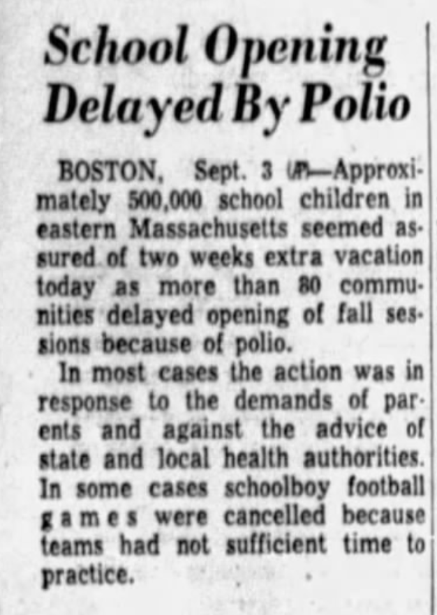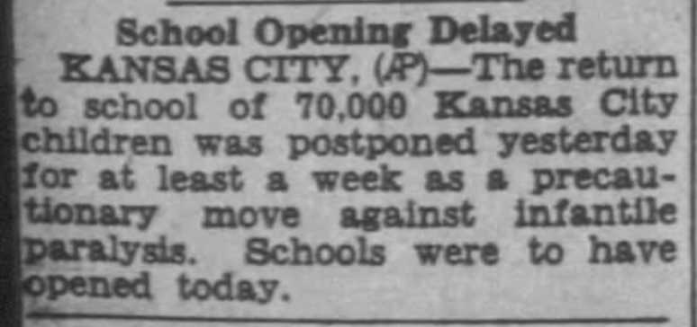 If we can't agree on masks and vaccine mandates, it might be worth mentioning that in the 1930s and 1940s, it was not unusual for schools to delay opening because of rising cases of polio over the summer.pic.twitter.com/tk2bnDhom5