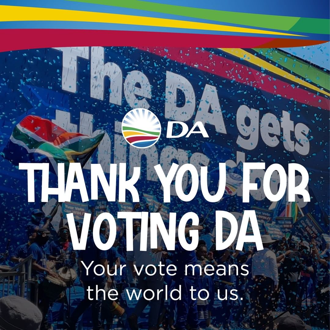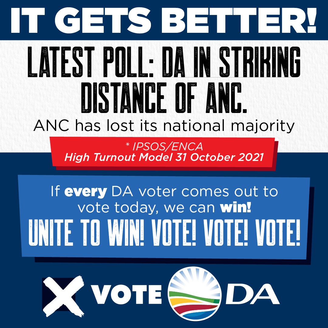 The ANC has lost its national majority! Go out and vote DA before 9pm. Only the DA is big enough to beat the ANC. A vote for a smaller party is a vote for the ANC, and the ANC would love you to vote for a smaller party rather than the DA.