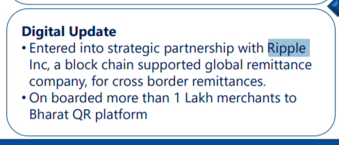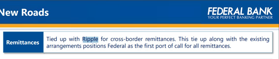 Federal Bank - Investor Presentation Q4 2019 • Entered into strategic partnership with Ripple • Ripple for remittances This tie up along with the existing arrangements positions Federal as the first port of call for all remittances. Full PDF https://www.federalbank.co.in/documents/10180/17253256/Investor+Presentation+Q4+FY+19/e674041f-5fda-4a59-a7ab-611bb9dcb81a …pic.twitter.com/5qV3CmQoBG