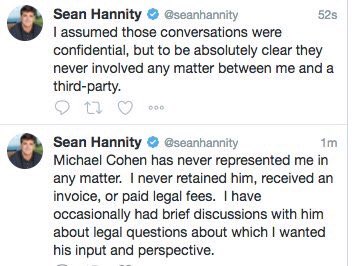 @seanhannity said that he never retained, never received a bill from, never hired but had a few occasions in which he asked him a question. Does this amount to A/C privilege? If so, how? No money changed hands.Thanks. Twitter will use this to make your timeline better. UndoUndo