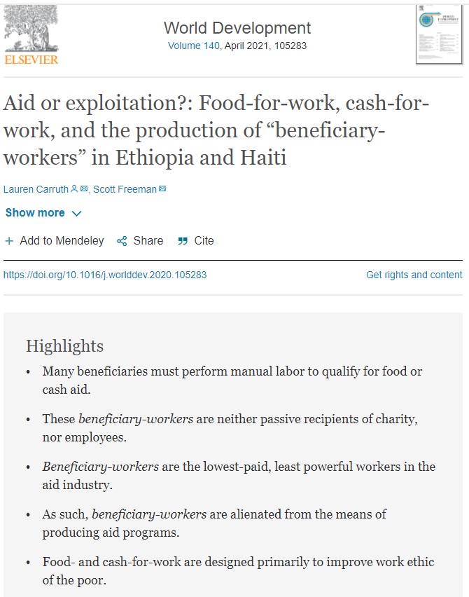 #publicworks in#Ethiopia and#Haiti presents ethnographic data questioning the ethics and appropriateness of 'food-for-work' and 'cash-for-work' programs. Carruth and Freeman https://www.sciencedirect.com/science/article/abs/pii/S0305750X20304101 …pic.twitter.com/VGuqnTk8uS