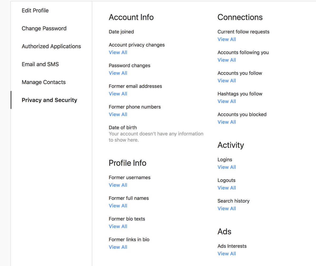 Was just checking what phone number I had on my Instagram and noticed that Instagram has IMO one of the most user-friendly "here is the old/meta data we have on you" pages:pic.twitter.com/m9QqNmCIGJ