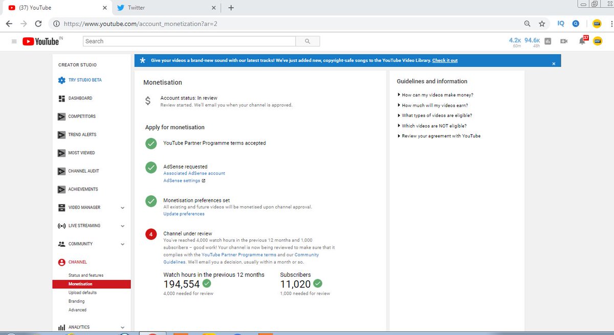 @TeamYouTube My Channel is completed the 4k hours watch time & 1k subscribers in last 365 days and still my channel monetization is not enabled please guide us... channel link :https://www.youtube.com/channel/UCICHPNcpxh6rH14kdSaygRg … … … thanks youtube Team....pic.twitter.com/UzJ79fSKZN