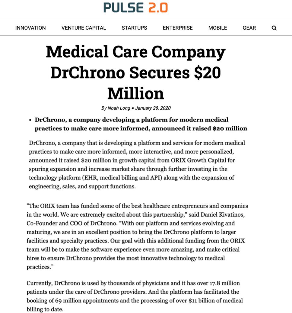 @DrChrono raises $20 million to build the healthcare platform of the future https://venturebeat.com/2020/01/13/drchrono-raises-20-million-to-manage-medical-clinic-booking-and-billing/ …#DrChronopic.twitter.com/pqy1mnExuR